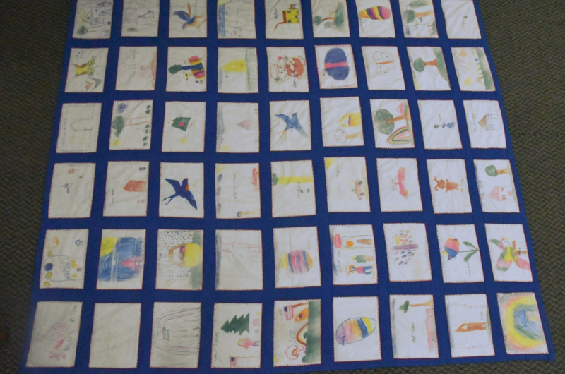 Image of the entire 72" x 84" 1980's Panel Quilt by Mrs. Edgar's class at Columbian School in Mattoon.
